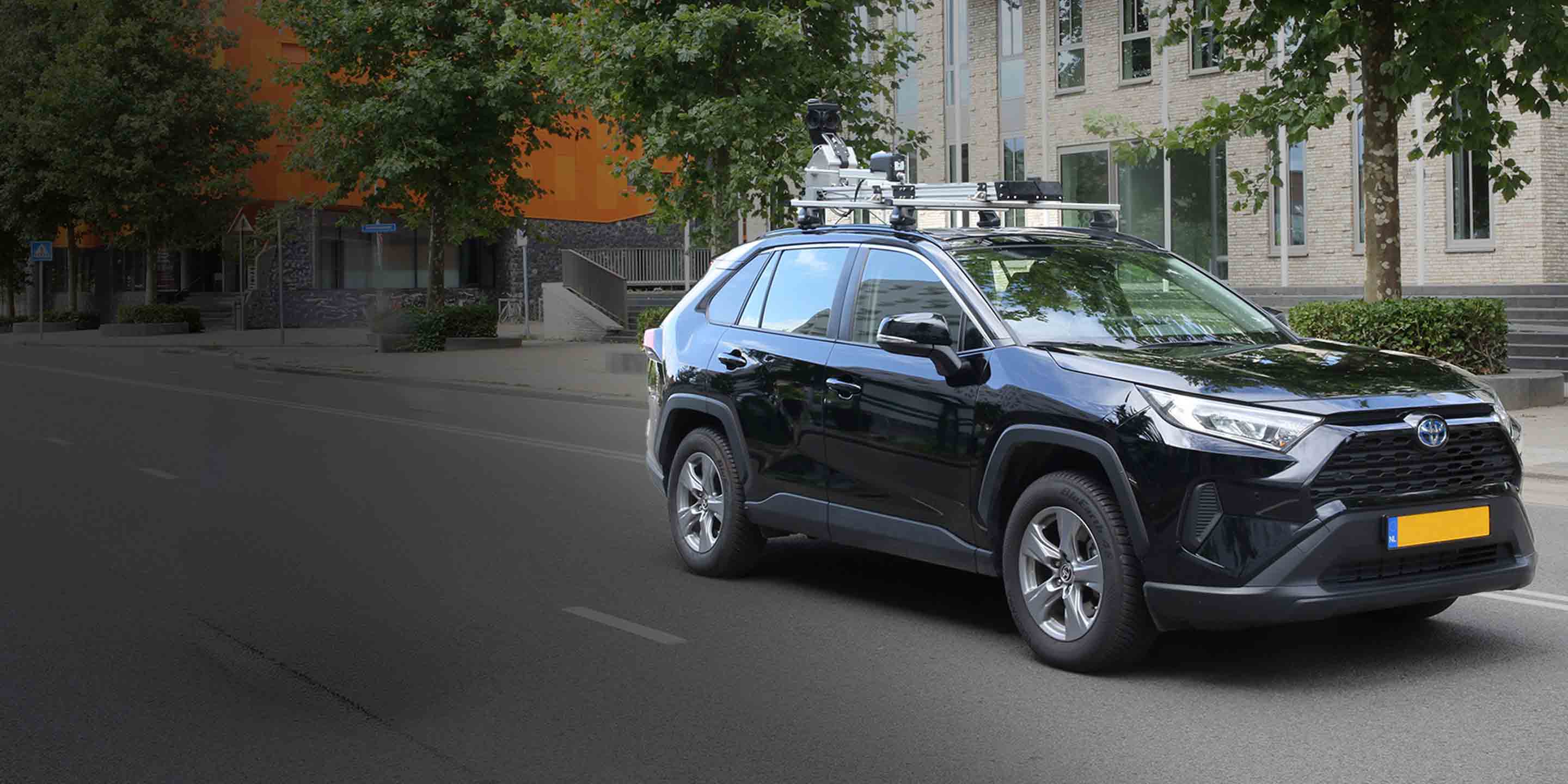 A black SUV equipped with the Vertex mobile mapping system leverages Trimble Applanix technology to capture high-accuracy data while driving.